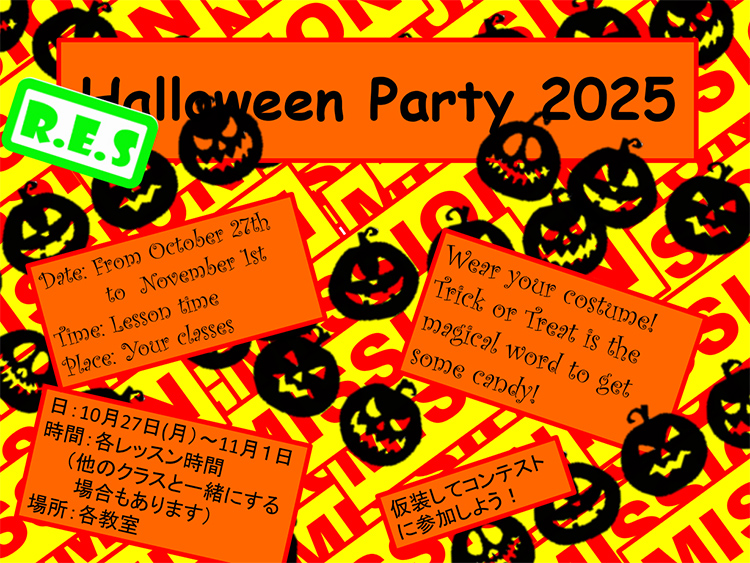 ハロウィーンパーティーのお知らせ 今年のハロウィーンパーティーは、10/27(月)から11/1(土)に開催しています! HOME RESの特徴 コース紹介 英会話クラス 英語学習クラス イベント情報 料金案内 生徒・保護者の声 アクセス